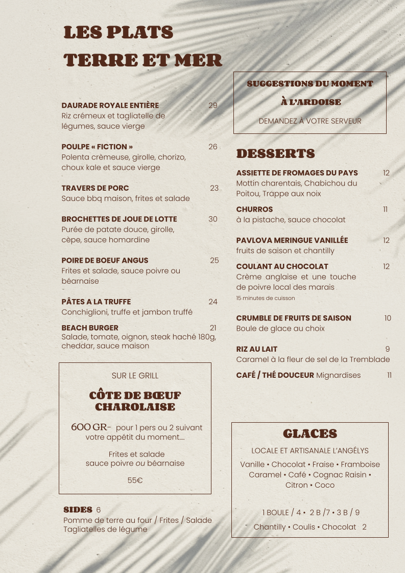 For wine lovers, the selection at Beach Bistro does not disappoint. Explore the rich flavors of Chinon Blanc AOP, a floral and fruity wine ideal for aperitifs at €29.00, or delight in the refreshing Muscadet AOC, known for its convivial and zesty notes at €27.00. Each sip is an invitation to savor the coastal charm of this enchanting region.
